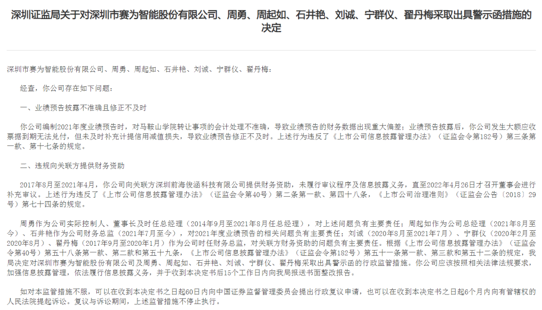 此外,五天三板的赛为智能()收到了深交所关心函。受限金额为2454万元。赛为智能高管逢高减持也遭到了监管关心。赛为智能收到深圳证监局下发的惩罚通知书,